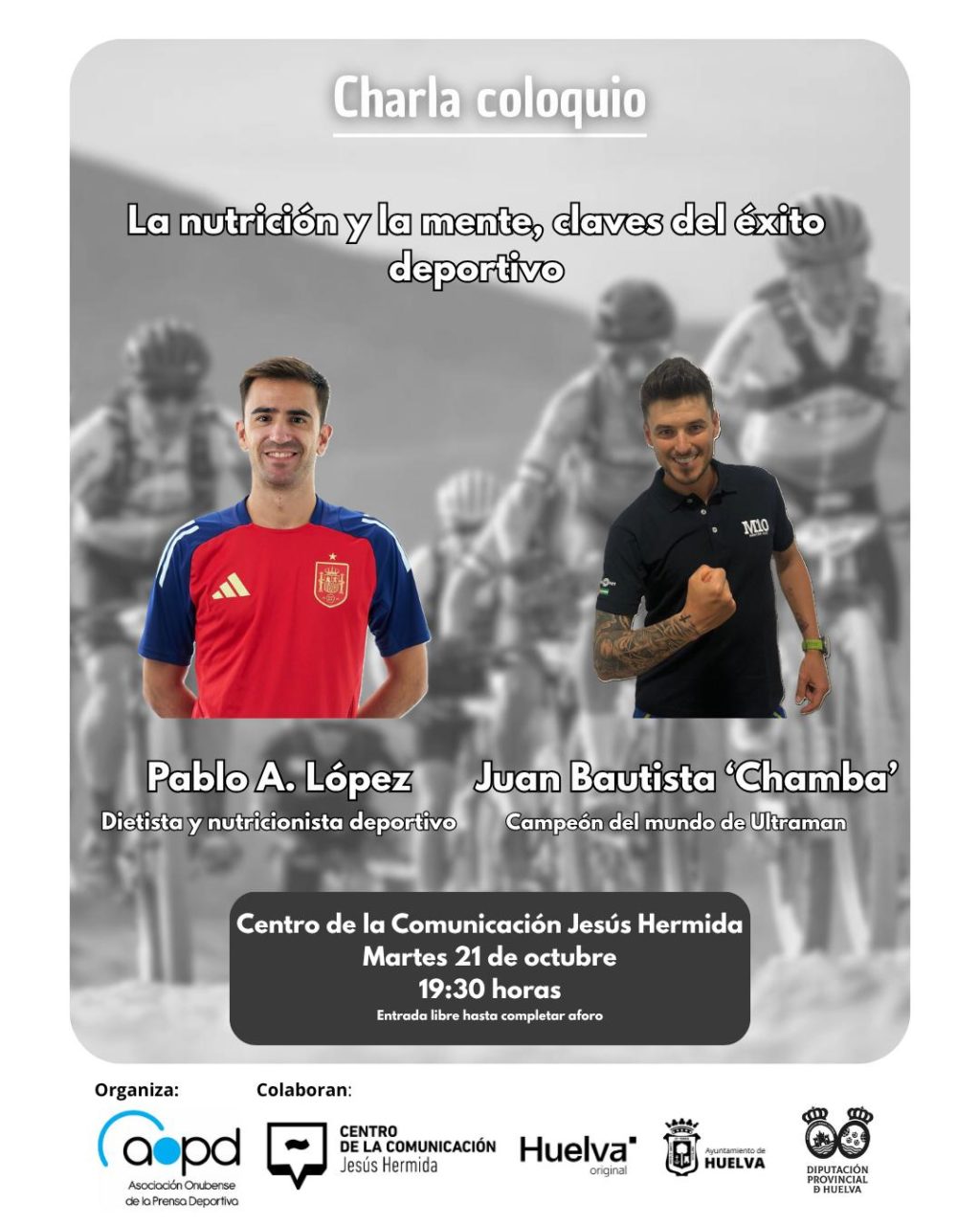 El próximo martes, 21 de octubre, a las 19:30 horas, el Centro de la Comunicación ‘Jesús Hermida’ de Huelva acogerá una charla-coloquio titulada “La nutrición y la mente en un deportista de élite”, protagonizada por el dietista-nutricionista Pablo A. López y el atleta, docente universitario y especialista en nutrición Juan Bautista Castilla, ‘Chamba’.